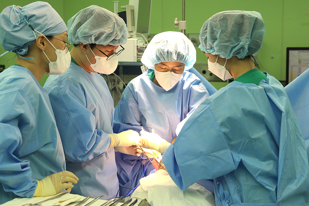 ▲ 서울아산병원 유방외과 이새별 교수(오른쪽에서 두번째)가 유방암 환자를 수술하고 있다.